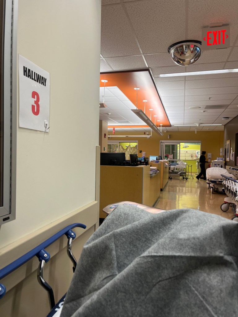 The next part is a blur – getting loaded on a stretcher, the buzzing of paramedics and law enforcement, my stranger angel saying goodbye once I’m in good hands. The gurney to the ambulance is bumpy – every jostle brings fresh stabs of pain. Once in the ambulance people are hooking me up to things and talking to each other and to me. Asking questions. Medical record number. Symptoms. Preferred hospital. The ambulance feels like a beehive of activity.